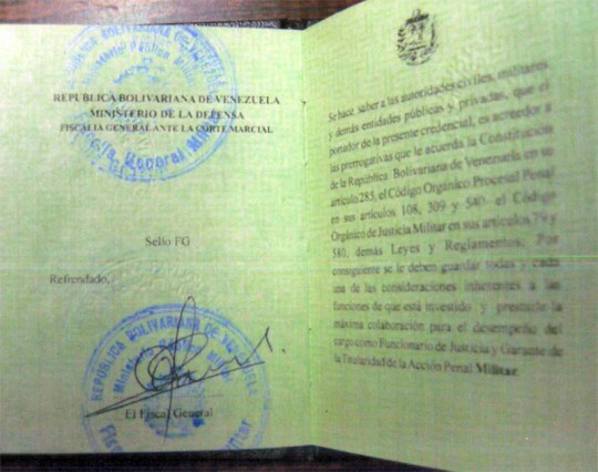 Credencial de la Fiscalía Militar del narcotraficante Makled entregada por Eladio Aponte Aponte |