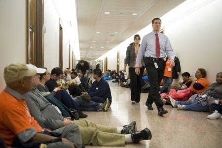 Activistas llenan los pasillos fuera de la oficina del Senador republicano Scott Brown en el Capitolio |